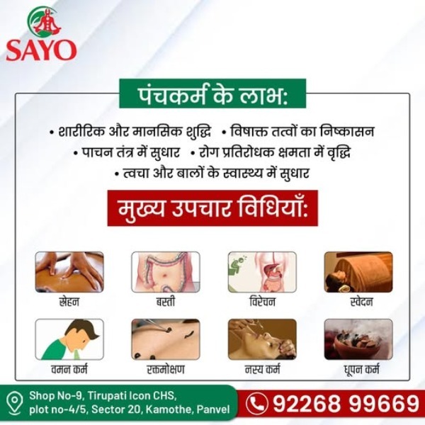 Benefits of Panchakarma 💊✨ 💆 ♂️ Physical and mental purification ⚡ Exposure of toxins 🍲 Sue in the digestive system... Benefits of Panchakarma 💊✨ 💆 ♂️ Physical and mental purification ⚡ Exposure of toxins 🍲 Improving the digestive system 💪 Increase in immune capacity 🌸 Improve skin and hair health Adopt Panchakarma for natural, effective and holistic health! 💚 Contect 📞 : 092268 99669 Address : Shop No-9, Tirupati Icon CHS, plot no-4/5, Sector 20, Kamothe, Panvel, Navi Mumbai, Maharashtra 410209 Youtube Link : www.youtube.com/@sayoayurvedgarbhasanskar5693 🌐https://www.sayoayurved.com #Panchakarma #आयुर्वेद #HolisticHealing #शारीरिकशुद्धि #मानसिकशुद्धि #Detox #पाचनसुधार #ImmunityBoost #त्वचास्वास्थ्य #बालोंकास्वास्थ्य #NaturalHealing #AyurvedicTreatment #WellnessJourney #StayHealthy #BodyAwareness #SelfCare #HealthyLifestyle #LifeMatters #AyurvedaCare #HealthTips. For more info visit us at http://www.sayoayurved.com/latest-update//271...