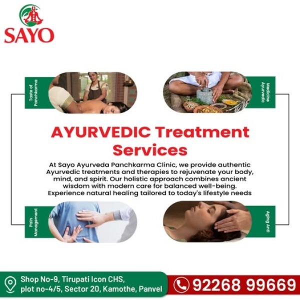 Ayurvedic Treatment Services at Sayo Ayurveda Panchkarma Clinic 🩺✨ Rejuvenate your body, mind, and spirit with authentic Ayurvedic therapies 💆♀️💖 Our holistic approach blends ancient wisdom with modern care for balanced well-being 🌸🧘♂️ Experience natural healing tailored for today’s lifestyle 🌿💫 Contect 📞 : 092268 99669 Address : Shop No-9, Tirupati Icon CHS, plot no-4/5, Sector 20, Kamothe, Panvel, Navi Mumbai, Maharashtra 410209 Youtube Link : www.youtube.com/@sayoayurvedgarbhasanskar5693 🌐https://www.sayoayurved.com #Ayurveda #Panchakarma #HolisticHealing #NaturalTherapy #WellnessJourney #BodyMindSpirit #AyurvedicTreatment #Rejuvenation #HealthyLifestyle #SelfCare #TraditionalHealing #MindBodyWellness #StayHealthy #AuthenticAyurveda #WellBeing #HealthyLiving #AyurvedaCare #StressRelief #BalanceYourLife #LifeMatters