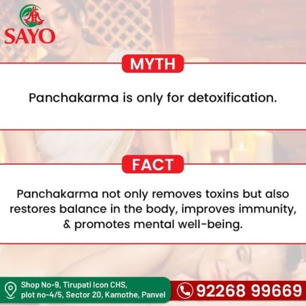 MYTH: Panchakarma is only for detoxification. ✅ FACT: Panchakarma goes beyond detox! 🌿 ✨ It restores balance in the body ⚖️ 🛡️ Boosts immunity 💪 🧘 Promotes mental well-being 🧠💫 Experience the holistic power of Ayurveda with Panchakarma. 🌸 Contect 📞 : 092268 99669 Address : Shop No-9, Tirupati Icon CHS, plot no-4/5, Sector 20, Kamothe, Panvel, Navi Mumbai, Maharashtra 410209 Youtube Link : www.youtube.com/@sayoayurvedgarbhasanskar5693 🌐https://www.sayoayurved.com #Panchakarma #AyurvedaHealing #AyurvedicTherapy #DetoxNaturally #BodyBalance #BoostImmunity #MentalWellbeing #HolisticHealing #AyurvedaWellness #AyurvedaForLife #NaturalHealing #AncientWisdom #HolisticLifestyle #MindBodyBalance #AyurvedicTreatment #WellnessJourney #HealingNaturally #AyurvedaTherapy #HealthAndWellness #SelfCareJourney