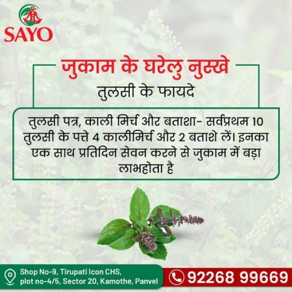 जुकाम के घरेलू नुस्खे – तुलसी के फायदे! 💚✨ सर्दियों में जुकाम और खांसी से बचाव के लिए अपनाएँ ये आसान उपाय 🌸 💊 तुलसी पत्र + काली मिर्च + बताशा 👉 रोज़ाना: 10 तुलसी के पत्ते + 4 काली मिर्च + 2 बताशे 💫 सेवन करने से जुकाम में बड़ा लाभ मिलता है और इम्यूनिटी बढ़ती है 💪 Contect 📞 : 092268 99669 Address : Shop No-9, Tirupati Icon CHS, plot no-4/5, Sector 20, Kamothe, Panvel, Navi Mumbai, Maharashtra 410209 Youtube Link : www.youtube.com/@sayoayurvedgarbhasanskar5693 🌐https://www.sayoayurved.com #TulsiBenefits #ColdRemedies #HomeRemedies #NaturalHealing #AyurvedaTips #ImmunityBoost #HealthyLiving #WinterCare #HerbalRemedies #AyurvedicCare #StayHealthy #WellnessTips #DoctorSonal #HolisticHealth #NaturalWellness #HealthyHabits #AyurvedicHomeRemedies #BoostImmunity #FluSeasonTips #HealingNaturally 🌿💚✨💊🤧