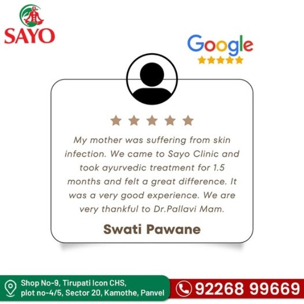 Thank you so much, Swati Pawane, for your kind words and trust in Sayo Clinic! 🌿💚 We’re truly glad to hear that your mother experienced significant relief from her skin condition through Ayurvedic treatment. 🌸✨ Your positive journey inspires us to continue offering authentic healing with care and dedication. Special thanks from Dr. Pallavi Ma'am as well! 👩⚕️💐 Wishing your mother continued health and wellness. 🌱😊 Contect 📞 : 092268 99669 Address : Shop No-9, Tirupati Icon CHS, plot no-4/5, Sector 20, Kamothe, Panvel, Navi Mumbai, Maharashtra 410209 Youtube Link : www.youtube.com/@sayoayurvedgarbhasanskar5693 🌐https://www.sayoayurved.com #GratefulHeart #HappyPatients #AyurvedicHealing #SkinCareNaturally #NaturalTreatment #SayoClinic #AyurvedaWorks #HolisticHealing #HealingJourney #Thankful #SkinInfectionRelief #AyurvedicCare #PatientExperience #AuthenticAyurveda #DrPallavi #WellnessThroughAyurveda #HerbalHealing #BodyMindBalance #HealingNaturally #TrustedCare